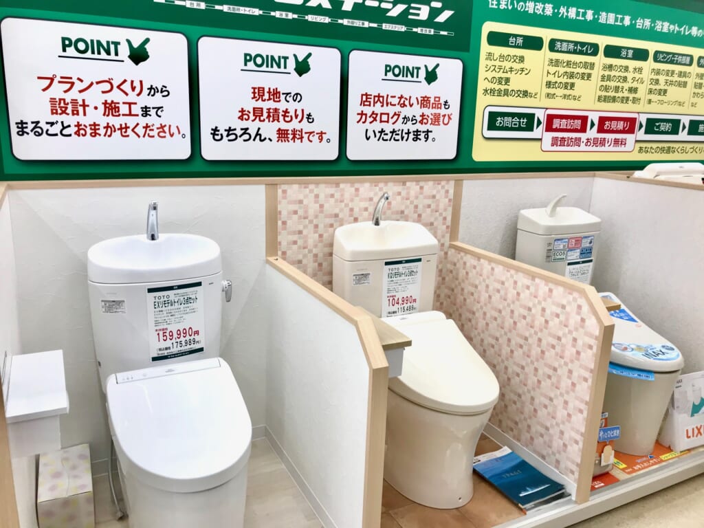 住まいのリフォームはおまかせください。ビルトインコンロ、トイレや洗面化粧台の展示もしているリフォームステーションが登場しました。リフォームをお考えの方によりイメージしやすいようにしました。お気軽にご相談ください。現地見積もり無料です。